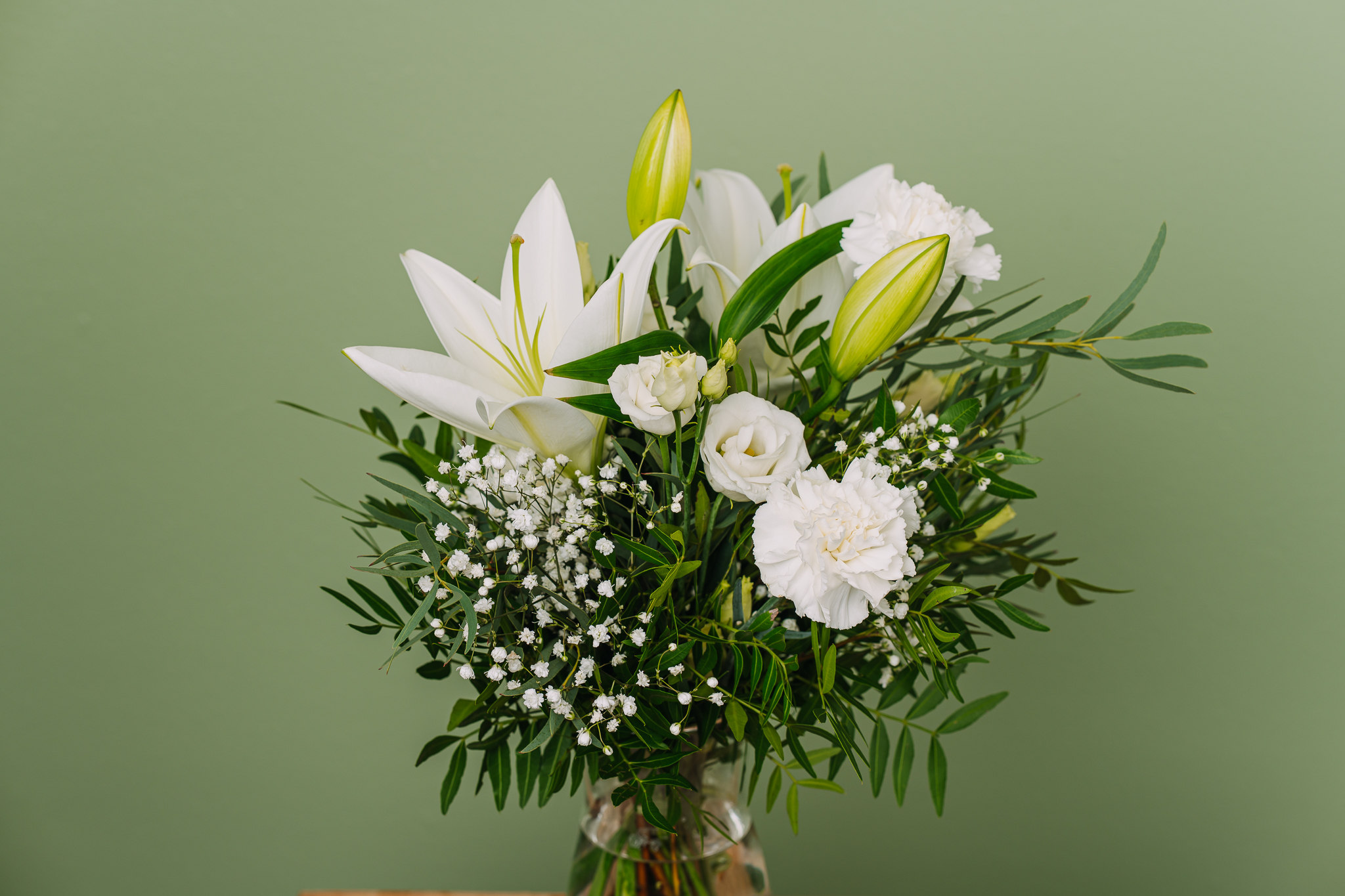 Floristen binder en vacker bukett utav vita olika slags blommor.