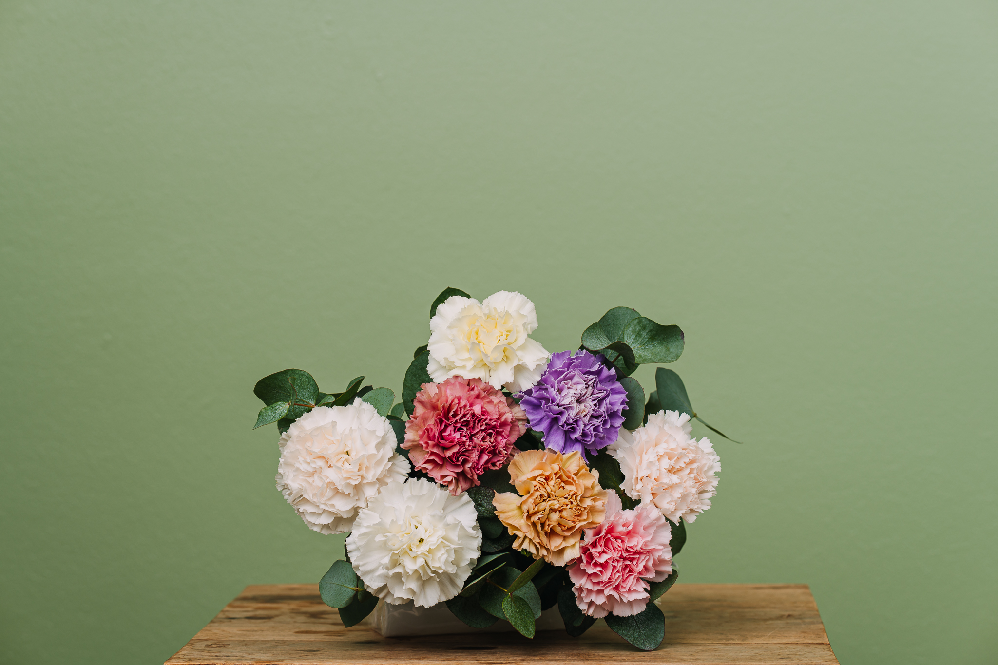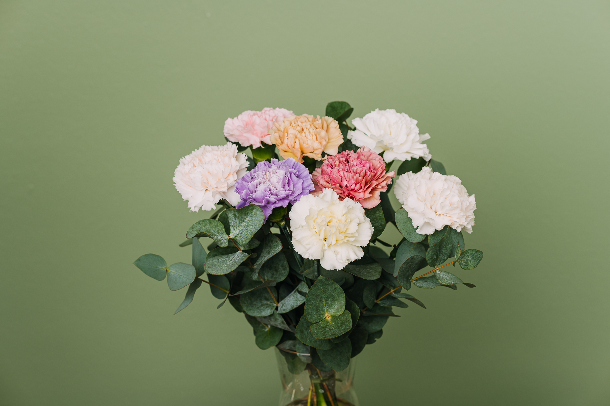 Floristi sitoo kauniin kimpun eri pastellin sävyisistä neilikoista ja leikkovihreistä.