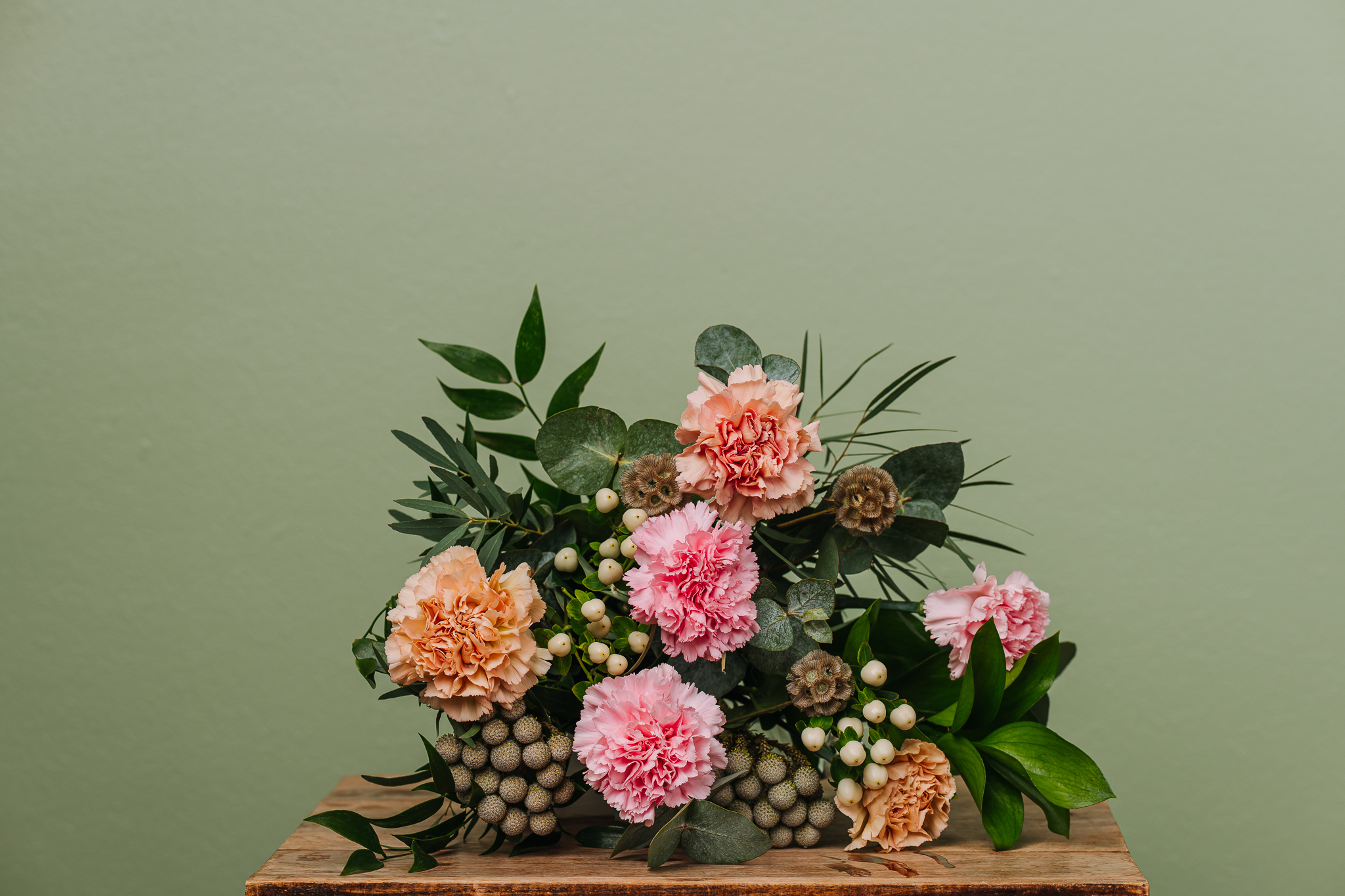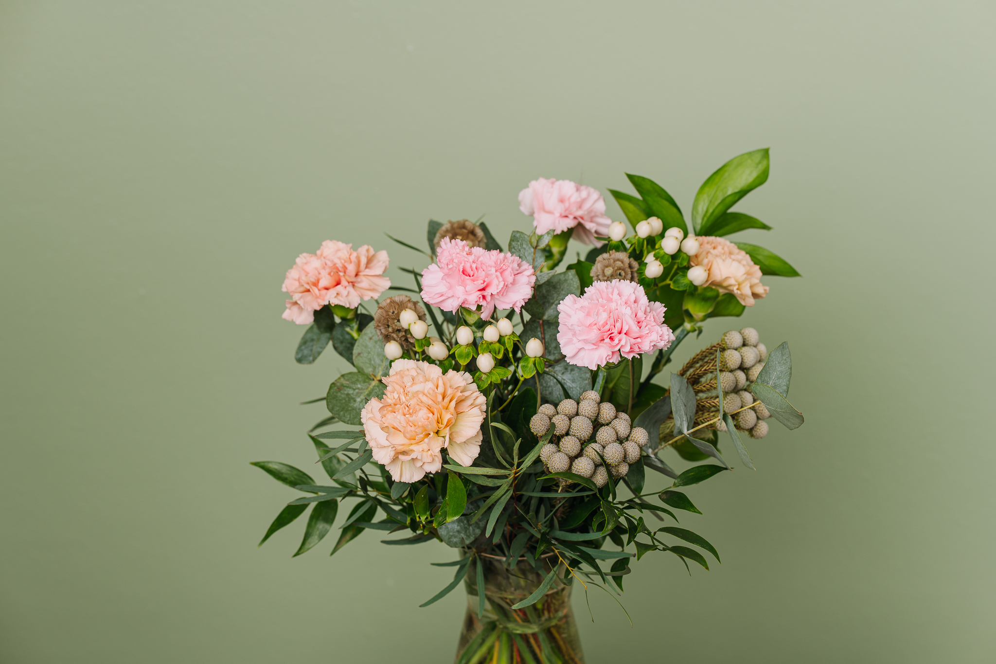 Floristi sitoo kauniin kimpun kauden trendikkäistä vaaleanpunaisista ja nuden värisistä kukista ja leikkovihreistä.